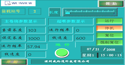 在觸摸屏主界面上,實(shí)時顯示當(dāng)前通訊變頻器的各項(xiàng)主要參數(shù),和當(dāng)前狀態(tài),分為:停機(jī)、運(yùn)行、故障等多檔指示。同時利用棒圖元件形象直觀地實(shí)時顯示了當(dāng)前絡(luò)筒機(jī)的長度參數(shù)。